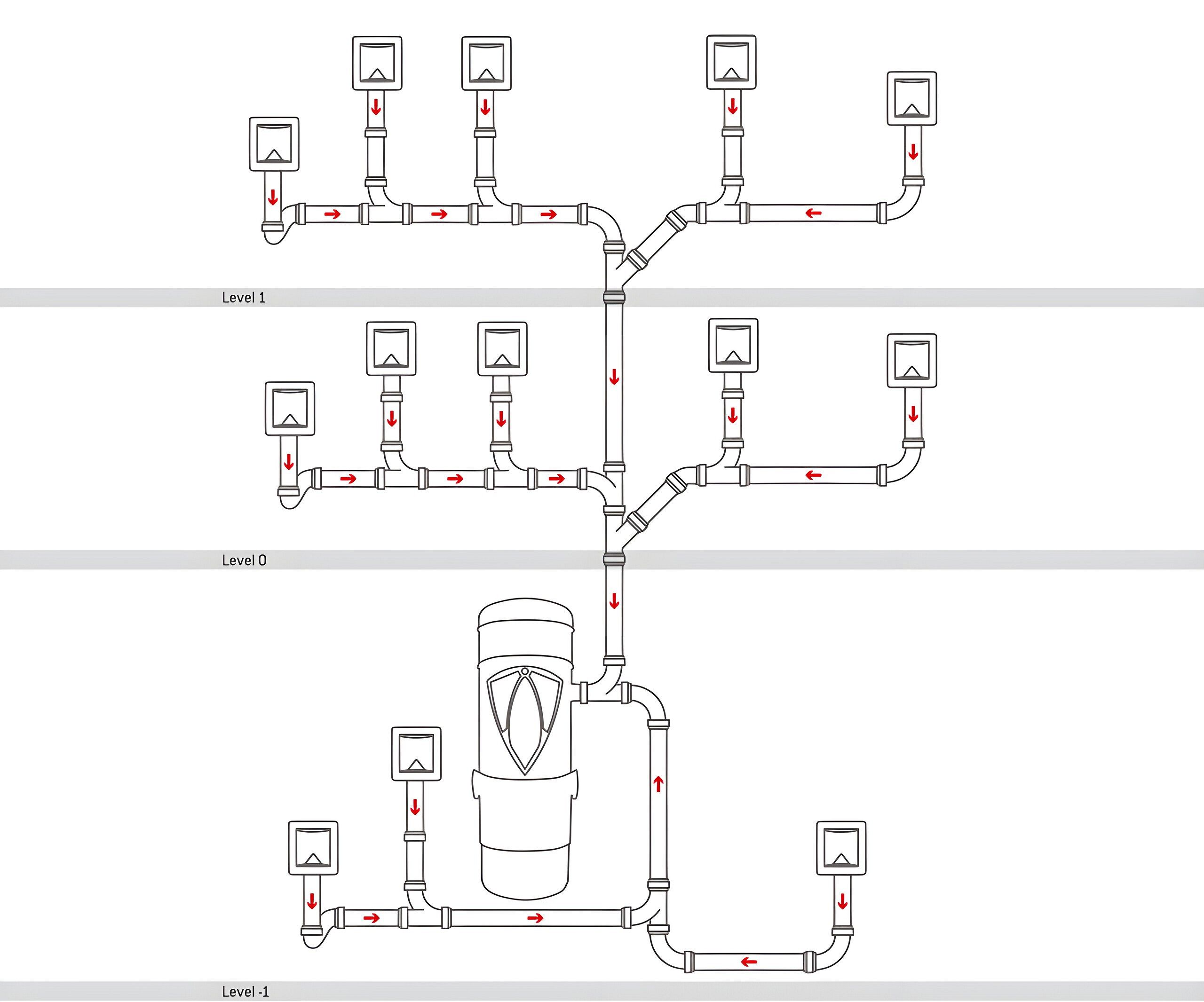 Wrzutowe porty są umieszczone w sypialniach i/lub łazienkach, dzięki czemu jest to wygodne i intuicyjne rozwiązanie dla domowników. Główna rura jest umieszczona zazwyczaj na strychu lub w suficie podwieszanym, aby zapewnić płynny przepływ ubrań. Co ważne, porty wrzutowe Laundry Jet można zainstalować na dowolnej wysokości, aby spełnić indywidualne potrzeby domu.